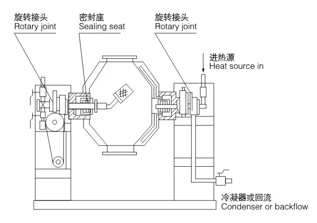 SZG双锥回转真空干燥机是我厂在结合国内同类产品技术所开发新一代干燥装置, SZG双锥回转真空干燥机具备皮带、链条两级弹性联结方式,因而设备运行平稳。特别设计的工装,充分体现了两支轴的良好同心,热媒及真空系统均采用可靠的美国技术的旋转接头。在此基础上,我们开发了SZG—A,它既可无级调速,又能进行恒温控制。原理
