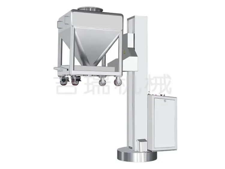 该机主要由底盘、立柱、提升系统等部件组成。工作时,先将装有物料的料斗推入料斗提升机的提升叉架上,然后启动提升按钮,料斗做提升运动,料斗到位后转动底盘与加料的设备密闭对接,开启出料蝶阀,使物料密闭转移到下一工序。