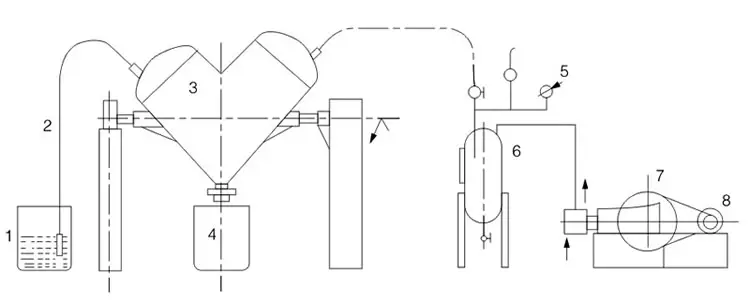 1.物料筒   2.吸料筒  3.混合机  4.出料筒   5.真空表   6.气体净化罐   7.真空泵  8.电动机
